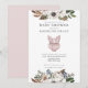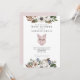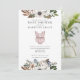 Denna inbjudan till baby shower har en akvarell-målad rosa overall och akvarell-blommor. Informationen om showern är skriven med en stilren typsnitt som är redo att anpassas. Baksidan på korten har en mjuk rosa färg. En fantasifull design som passar perfekt för shower eller sprinkle.
