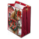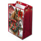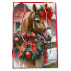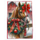 julklapp. En söt brun häst med en söt röd båge bakom ett rostfritt trästängsel med en festlig vind på den. I bakgrunden är en gammal, rustik röd lada.
