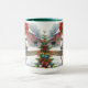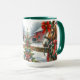Julkaffe mugg. med en vattenfärgad illustration av en rustik lada och en söt brun häst och en gammal röd rustik lada.