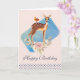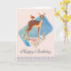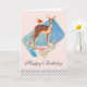 Ett lyckligt födelsedagsgratulationskort med en söt brun hjort med en vit fläckig rygg. En liten fågel som sitter på hjortens rygg. En fin blomsterbukett med akvarellrosor och ljus olivgröna blad under hjortens fötter. En blå akvarell rektangel bakom bilden. En prickig kant längst ner. Osculdig och söt design med rustik elegans. Persikoröd bakgrund. Ditt personliga meddelande på insidan.