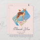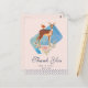 Ett party tack-kort med rustik elegans, Designat med en söt brun hjort med vit fläckig rygg. En liten fågel som sitter på hjortens rygg. En fin blomsterbukett i pastellrosa och ljust olivgrönt under hjortens fötter. En blå akvarell rektangel bakom bilden. En prickig kant längs botten. Oskuldig och söt design med rustik elegans. Persikorosa bakgrund.