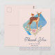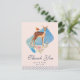 Ett tackkort för fest med rustik elegans, Designat med en söt brun hjort med vit fläckig rygg. En liten fågel som sitter på hjortens rygg. En fin blomsterbukett i pastellrosa och ljust olivgrön under hjortens fötter. En blå akvarell rektangel bakom bilden. En prickig kant längst ner. Osculdig och söt design med rustik elegans. Persikorosa bakgrund.