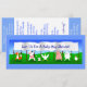 Söta tecknade djur med armarna uppåt, håller upp en banderoll som säger "Join Us For a Baby Boy Shower". En räv, ko, mus, fågel eller gås, en gris, ett får och en höna är uppradade i en rad, utomhus på en grön gräsrik kulle med en blå himmel i bakgrunden. Baksidan upprepar den blå himmelns färg som en övre och undre kant. Anpassa och fyll bara i din information efter behov i de tomma utrymmena. En rolig och fantasifull design som säkert kommer att få dina gäster att bli glada för evenemanget. Passar endast till denna produktstorlek.