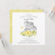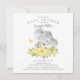 Beklagligt glad elefant med söt gula blommor för en könsneutral babydusch. Vänd över inbjudan om du vill se en samordning tillbaka för en speciell beröring i extra.