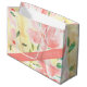 Flödesformad presentväska i koral och rosa, grattisar kan vara personlig till vilket meddelande som helst eller text och banderoll kan tas bort. Korallbakgrunden kan placeras i vilken färg som helst.