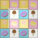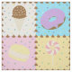 Tillfredsställ din söta tand med den här färgstarka mönster med smakfulla smak som en chokladglass, en lila frostiserad chokladdräkt, en citrongul gult makaron och en rosa och vit snurrande glapp åtskild av choklad chip och omgiven av regnbågssprinkler på fyra briggt huggna fyrkanter.