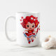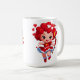 Livfull tecknad Cupid med vingar, en röd klänning och en båge flyger över en hjärtfylld röd bakgrund. Perfekt för Alla hjärtans dag, romantik och familjeinriktade projekt.