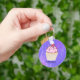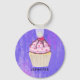 Nyckelkedjans personlig med namn och designad med en illustration av en utsökt tittar kaka. Rosa frost och chokladdrizzel. En gult cupkakhållare och en hallon ovanpå. Yummy! Bakgrunden är en lila abstrakt struktur med små hjärtan sprinklade runt.