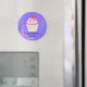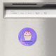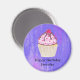 En magnet-personlig med namn och designad med en illustration av en utsökt tittar cupkaka. Rosa frost och chokladdrizzel. En gult cupkakhållare och en hallon ovanpå. Yummy! Bakgrunden är en lila abstrakt struktur med små hjärtan sprinklade runt.