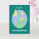 En mycket söt Belated March Birthday Card, med en klump daffodils mot blå bakgrund med grönt gräns och vit text, från en vattenfärgsmålning av Judy Adamson. Känn dig fri att även anpassa insidermeddelandet.