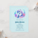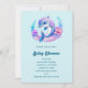 Baby shower-inbjudan med en förtjusande illustration. En blå och lila delfin omgiven av vackra undervattensblommor.