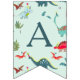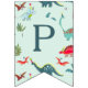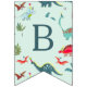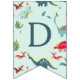 Barn kommer att älska detta blå dinosaurie mönster på sina flaggor för en födelsedagsfest med på varje flagga en bokstav som stavas GRATTIS PÅ FÖDELSEDAGEN. Originalkonst av Caroline Bonne Müller