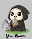 Denna söta chibi-illustration återföreställer den ikoniska Grim Reaper på ett lekfullt och lättsamt sätt. Karaktären har ett sött, krämfärgat skallansikte med stora gnistrande ögon, ett glatt leende och en liten tand som sticker ut ur munnen.