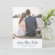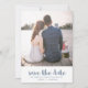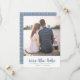 Bröllop spara datum-kort med enkel och chic har en söt dammig blå och vit polka-punktutskrift med penselskripttypografi. Lägg bara till namn och favoritfoto för att göra den här klassiska designen till din egen.