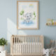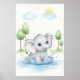 Denna glada babyelefant stänker lekfullt i en gnistrande vattenpöl på en solig dag. Med stora, ljusblå ögon och en glad leende, njuter denna söta lilla elefant av det svala vattnet medan den är omgiven av milda gröna träd och fluffiga vita moln. Denna söta och charmiga illustration ger värme och lycka till alla barnrum eller sovrum.
