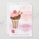 Ice kräm-inbjudan till en Sweet One! En söt och söt design för din lilla flickas coola sommar-födelsedagsfest. Konstruktionen har en glass med en skiva av jordgubbar och glass i choklad, varsvalar, chokladsås och färska jordgubbshalvor. Den har en vattenfärg som tvättar bakgrund i en tropiskt sunset sorbet av rosa och persika med vismisk typografi.