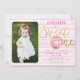 Visa din födelsedvänjas vackra leende med den här vackra fotoinbjudan! Designat med rosa vattenfärgen rand, guld "Sweet One"-skript, en sprinklumma och ett utrymme för ditt barns foto, är inbjudan perfekt för en donut- eller bakverk-stil första födelsedag party. Anpassa den för en minnesvärd och roligt firande.