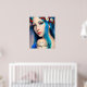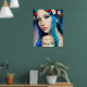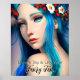 Dream Big och Live din Fairy Tale-offert. Söt skämtade med blått hår och röda och vita blommor i hennes hår och blå ögon. Fantasy art ai art. generativecContent