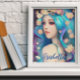 Personlig poster med sagor, Söt saga med blått hår och blommor i hennes hår och blått ögon. Fantasy art ai art. generativecContent