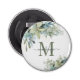 Elegant Eucalyptus Botaniska Blommigten Monogram Flaska-öppnare med vår vackra eukalyptus grönt och dammiga blå greer och modern typografi. Enkel att anpassa med din information för en söt flaska-öppnare. Kontakta oss på cedarandstring@gmail.com om du behöver hjälp med designen eller matchande produkter.
