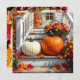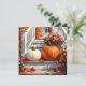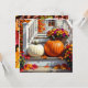En underbar fullt av Thanksgiving i personlig av färgstarkt vibrerande Höst löv och pumpor sitta på ett gårdshus framsteg. Du kan anpassa ditt Thanksgiving-meddelande på baksidan i personaliseringsområdet.