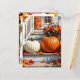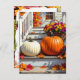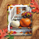 En underbar Thanksgiving av personlig vykort fullt av färgstarkt vibrerande Höst löv och pumpor sitta på ett gårdshus framsteg. Du kan anpassa ditt Thanksgiving-meddelande på baksidan i personaliseringsområdet.