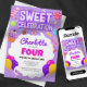 Följ med i det söta firandet! Denna bedårande Candyland-inspirerade födelsedagsinbjudan har färgglada godisar, läckra cupcakes och glada ballonger, perfekt för en fest full av sockerrika godsaker och glada minnen.
