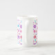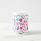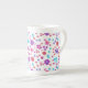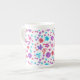 En söt Bone China Mugg som ska anpassa sig, med en mönster av blommor i lila, turkos, rosa och orange på vit bakgrund, från en handmålad papper kollage av Judy Adamson.