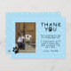 Söt fotavtryck blå födelsedags tack foto vykort för barn. Sött foto födelsedag tack kort med tassavtryck, tacknota, en fotomall och ett barns namn. Bakgrunden är blå med ett vitt prickmönster. Infoga ditt foto i mallen och gör det personligt med ditt namn. Ändra eller lämna tackmeddelandet.