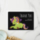 Tackkort med en bild av en Frankenstein enhörning. Lila och gröna färger. Kusligt söt.