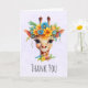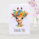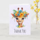 Tackkort med en fantasifull akvarellillustration som visar en giraffs ansikte som bär en vacker vårblomkrona. Färgglatt och sött.