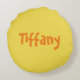 En rund söt giraff-kudde, denna vara har en ljusbrun bakgrund med en giraff på framsidan. Baksidan har en plats för att skriva in ditt namn i orange. Gör din personlig idag!