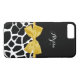 Ett svartvitt och vitt giraffe-utskrift Barely ToPhone 7 Fodral med ett gigly golden gult band bundet till en chic båge. Anpassa den här mobila enheten för snyggt till fodral genom att lägga till ditt namn. Platt utskriven bild, inte verklig båge.