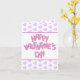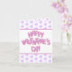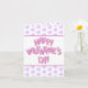 Det här glada Alla Hjärtans Dag-kortet har meddelandet "Glad Alla Hjärtans Dag" stavat med roligt arrangerade realistiska rosa frostade kakutsnitt på framsidan av kortet - meddelandet på insidan kan anpassas - bakgrunden är ett mönster av mindre rosa/lila gradienthjärtan på vit bakgrund - av katz_d_zynes
