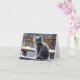 Söt grå kattunge njuter av det fallande snöfallet. Tom insida för ditt personliga meddelande. Perfekt för födelsedagsönskningar, helgdagar, tackkort etc.