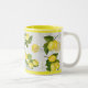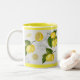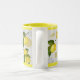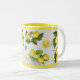 Kaffet lycklig mugg med citroner på grått-bakgrunden med fruktskisser. Den är en del av en matchande uppsättning (matduk, kökshandduk och väggklocka).