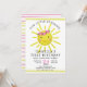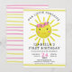 Söt inbjudan till solskens födelsedagsfest för att fira ditt lilla solskens första födelsedag. Du har en söt gul sol med rosa blommor illustration för att återspegla ditt tema för solskens födelsedag. Randigt mönster i rosa och gult på baksidan ger en modern look till inbjudan till solskensfesten. Anpassa med detaljer. Vänligen kontakta för hjälp.