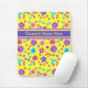 En söt Mousepad som kan personalisera, med ett mönster av blommor i lila, turkos, rosa och orange mot bakgrund av gulten i solsken, från en handmålad papper kollage av Judy Adamson. Om du vill kan du enkelt ändra bakgrunden till färg genom att klicka på Redigera.