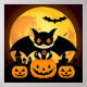 Illustrerad Halloween-inspirerad konst med en charmig katt med vingar på en pumpa, bakbelyst av en lysande fullmåne, omgiven av festliga fladdermöss och jack-o'-lanterns, som fångar en fantasifull och kuslig atmosfär.