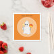 Sött Halloween-spöke som håller ett ljus och en pumpa på orange & vita pappersservetter.