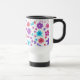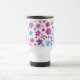 En söt Resemugg, med en mönster av blommor i lila, turkos, rosa och orange på vit bakgrund, från ett handmålat pappert kollage av Judy Adamson.
