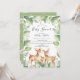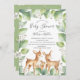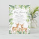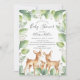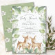 Cute baby hjort med mamma och pappa med bladgröna och udda vita blommor. Vänd över vårt par inbjudan för att se en samordnande blommigt tillbaka för en speciell beröring i extra.