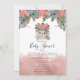 En söt liten akvarell igelkott sitter längst fram i mitten med en blomsterbukett ovanpå huvudet omgiven ovan med en vacker akvarell blomsterkant och nedanför av ett vackert korallrosa akvarellmoln. Baksidan har ett blommönster överlagt på en korallrosa akvarellbakgrund. Allt som behövs är dina detaljer för att göra denna Baby Shower-design komplett.
