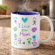 Visa mamma din kärlek med denna söta Jag älskar dig mamma-ritning. Whimsical handritade hjärtan och blommor omger söt handskriven stil bokstäver i en lekfull stil. Perfekt hjärtlig present till Mors dag, födelsedagar eller vilken dag som helst för att lysa upp hennes morgonkaffe eller te-rutin. Ett roligt, personligt sätt att säga tack från barn eller hela familjen.