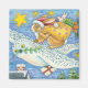 Gammaldags illustration God jul semester bild med en söt kanin utklädd till en jovialisk jultomte med en säck full av kaninmat (sallad och morötter) och leksaker. Kanin Tomte flyger på en uggla istället för en släde och ugglan bär en present i sina klor; en olivkvist för att symbolisera fred.