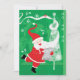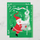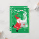 Vintageillustration God Jul semestertema med en glad, jolly tomte som bär en traditionell hatt och har en stor leende eller grin, skrattar. Tomten håller notblad medan han försöker sjunga och dansa med sitt långa vita skägg lindat runt ett julgran. Musiknoter och snöflingor virvlar runt i luften. Ho ho ho, God Jul och trevliga högtider!