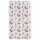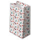 Söt jul tema presentpåse med ett upprepat mönster av gröna julgranar, varma ullhandskar, söta julstrumpor och röda kulor på en vit bakgrund.