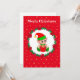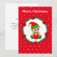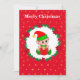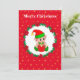 Söt julalf, tallkrans, julstjärna, bollar och gyllene stjärnor på röd julhälsningskort. All text är redo att anpassas.