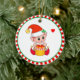 Söt julalva som håller en presentlåda på vit och röd keramisk julgransprydnad.