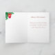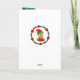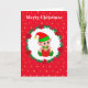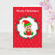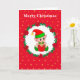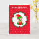 Söt julalva, tallkrans, julstjärna och gyllene stjärnor på röd julhälsningskort. Text redo att anpassas.